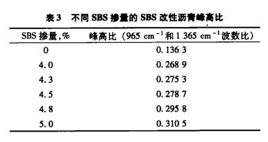 SBS改性劑摻入到瀝青中是一種物理的改性方法,并沒有與基質瀝青發生化學反應。所以SBS中所含丁二烯官能團不會因加人到基質瀝青中而發生變化。由此可以認為,通過紅外光譜法得到的不同SBS摻量966/cm處特征峰的吸光度值與其對應的摻量存在一定的線性關系,從而得出一條標準曲線,對日后改性瀝青樣品進行吸光度掃描后與該曲線進行比對,直接得出樣品中SBS的摻量。