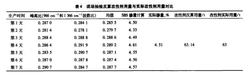 進一步驗證方法的可行性,同時對現場抽檢的樣品進行大量的檢測和SBS用量進行統計反算。現場通過采集收集一周的生產改性瀝青的用為量和使用的改性用量(生產1400t改性瀝青,程可作消耗改性劑63t(摻量4.5%)),并每天檢測改算方性劑摻量,通過檢測連續十天的摻量的檢測結果與所使用掉的改性劑量進行對比(見表4)。