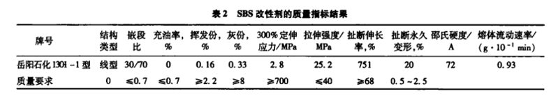 本試驗使用的基質瀝青為70號泰普克道路石油瀝青,SBS改性劑為線型岳陽石化1301-1型改性劑,原材料的檢測結果見表1和表2。